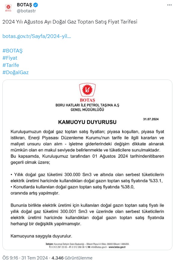 Boru Hatları İle Petrol Taşıma AŞ (BOTAŞ), ağustos itibarıyla konutlarda kullanılan doğal gazın toptan satış fiyatında yüzde 38 zam yapıldığını duyurdu.