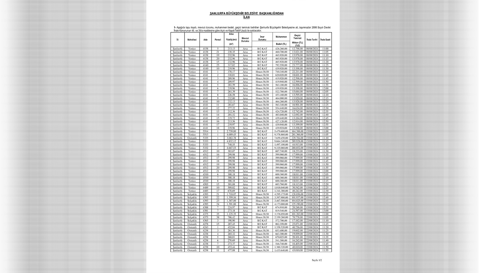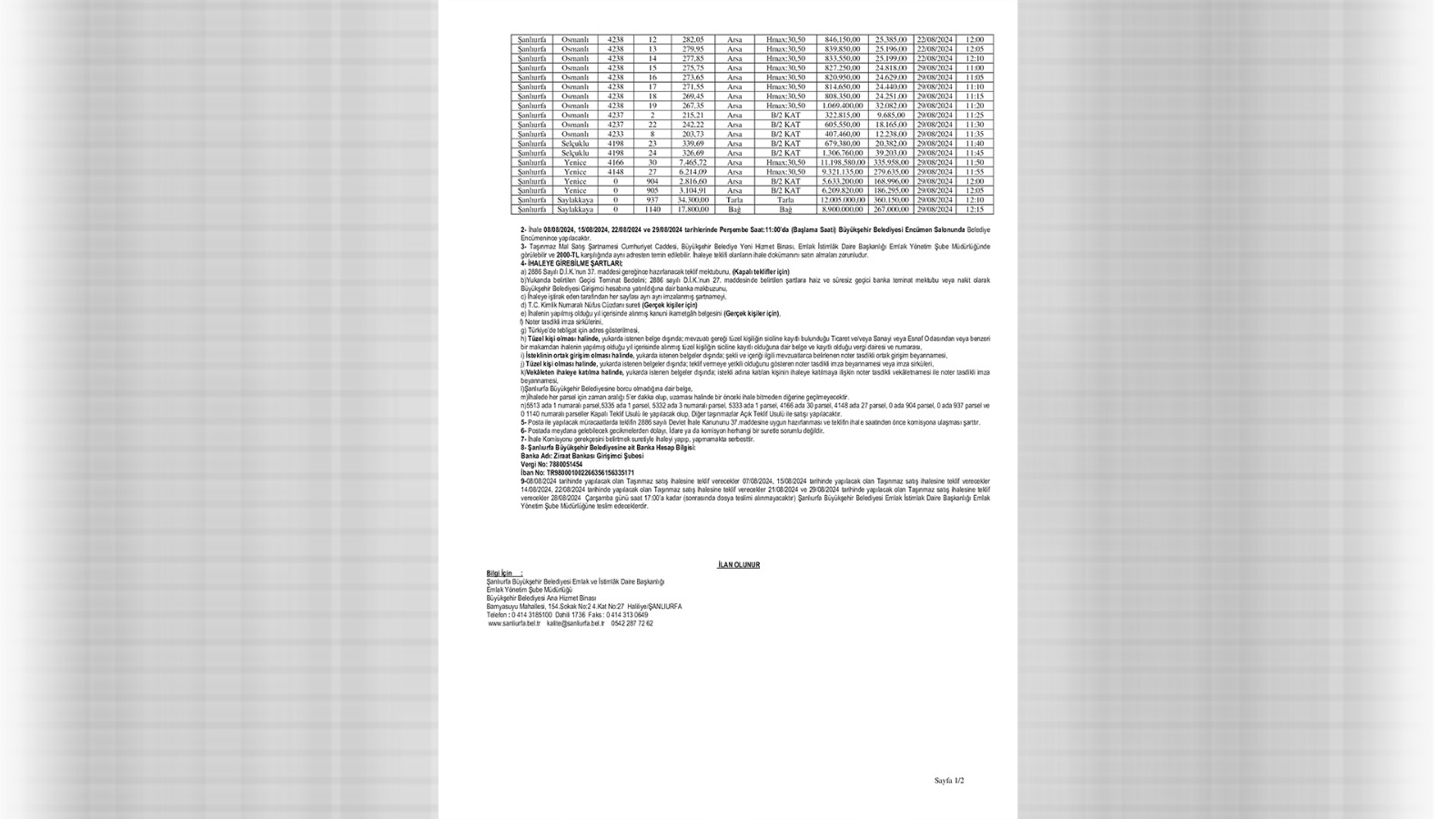 Söz konusu arsa satışlarına ihale 08.08. 2024, 15.08.2024, 22.08.2024 ve 29.08.2024 tarihlerinde Perşembe saat 11.00’da (Başlama Saati) Büyükşehir Belediyesi Encümen Salonunda Belediye Encümenince yapılacak.İhalede her parsel için zaman aralığı 5’er dakika olup, uzaması halinde bir önceki ihale bitmeden diğerine geçilmeyecek. Kaynak: Ajans Balıklıgöl