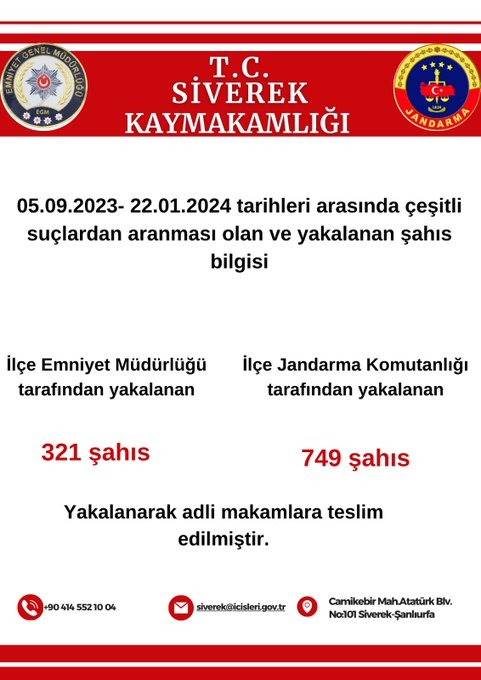 Siverek İlçe Emniyet Müdürlüğü ve İlçe Jandarma Komutanlığına bağlı ekipler tarafından 4 aylık süre zarfında aranan şahıslara yönelik yapılan operasyonlarda toplamda 1070 kişi yakalanarak gözaltına alındı.