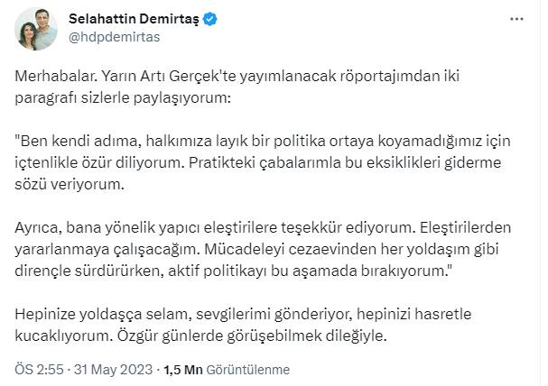 Eski HDP Eş Genel Başkanı Selahattin Demirtaş, sosyal medya hesabından bir paylaşımda bulundu. Yaptığı paylaşımda, “Ben kendi adıma, halkımıza layık bir politika ortaya koyamadığımız için içtenlikle özür diliyorum. Mücadeleyi cezaevinden her yoldaşım gibi dirençle sürdürürken, aktif politikayı bu aşamada bırakıyorum." Dedi.