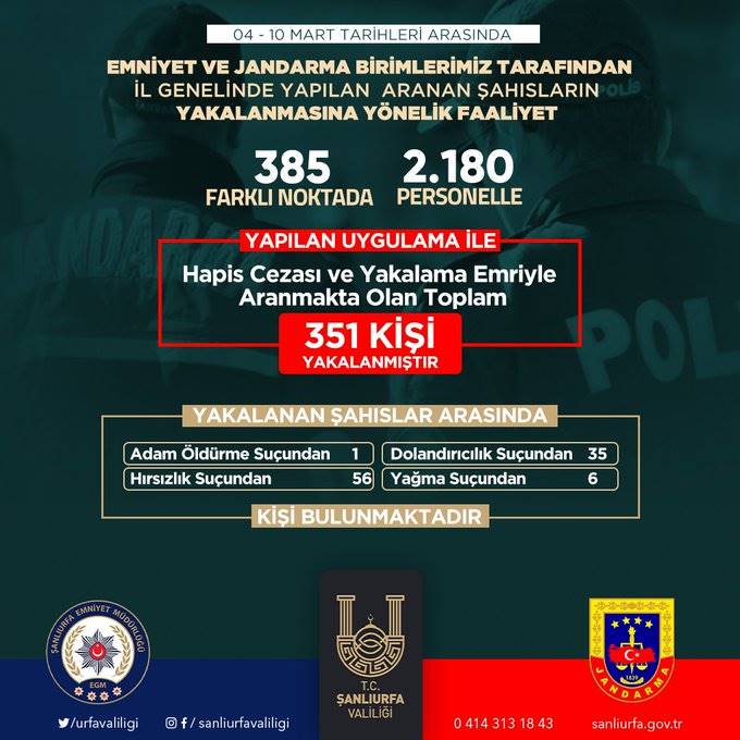 Şanlıurfa İl Emniyet Müdürlüğünce ve İl Jandarma Komutanlığınca aranan şahısların yakalanmasına yönelik 385 farklı noktada ve 2 bin 180 personelin katılımıyla son bir haftada yapılan uygulamalarda, hapis cezası bulunan ve yakalama emriyle aranmakta olan 351 kişi yakalandı.