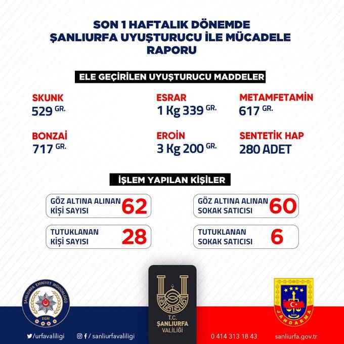 Şanlıurfa İl Emniyet Müdürlüğünce ve İl Jandarma Komutanlığınca son bir haftada uyuşturucuya yönelik yapılan operasyonlarda, gözaltına alınan 122 şahıstan 34’ü tutuklandı.