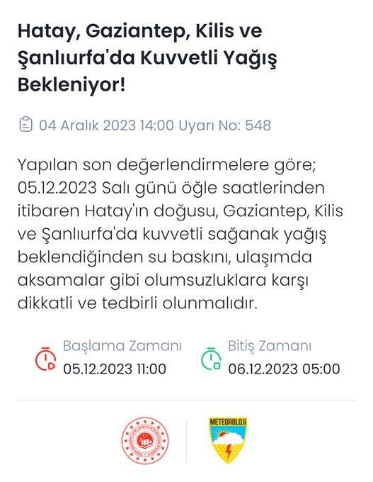“Yapılan son değerlendirmelere göre; 05.12.2023 Salı günü öğle saatlerinden itibaren Hatay’ın doğusu, Gaziantep, Kilis ve Şanlıurfa’da kuvvetli sağanak yağış beklendiğinden su baskını ulaşımda aksamalar gibi olumsuzluklara karşı dikkatli ve tedbirli olunmalıdır.”
