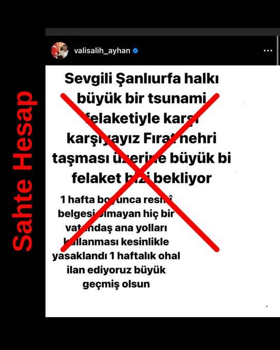 Şanlıurfa Valisi Salih Ayhan vatandaşlara uyarıda bulunarak, ‘’ Yaşadığımız deprem sürecinde olduğu gibi, şimdi de bazıları ilginç şekillerde ortalığı karıştırmak için iş başında. Lütfen resmî açıklamalarımız haricindeki asılsız paylaşımlara inanmayın.’’ Dedi.