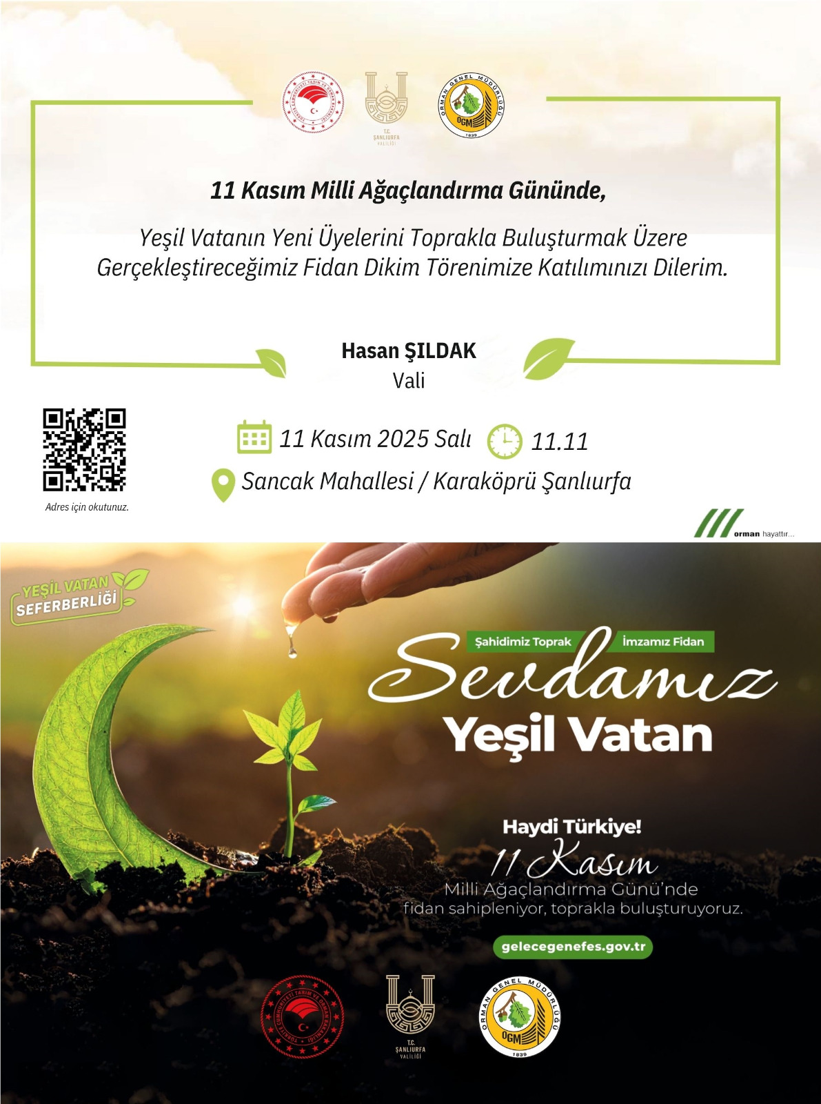 2019 Yılında Cumhurbaşkanımız Sayın Recep Tayyip Erdoğan önderliğinde ilki kutlanmaya başlanan ve her yıl ülkemiz genelinde coşkuyla kutlanmaya devam edilen 11 Kasım Milli Ağaçlandırma Bayramı fidan dikim etkinliği bu yıl da "Şahidimiz Toprak, İmzamız Fidan, Sevdamız Yeşil Vatan" şiarıyla Orman Bakanımız Sayın İbrahim Yumaklı’nın öncülüğünde, Şanlıurfa Valimiz Sayın Hasan Şıldak'ın teşrifleriyle Şanlıurfa Orman Bölge Müdürümüz Sayın İsmail Poyraz'ın ev sahipliğinde 11 Kasım Salı Günü Saat 11.11'de Karaköprü Sancak Mahallesinde gerçekleştirilecektir.