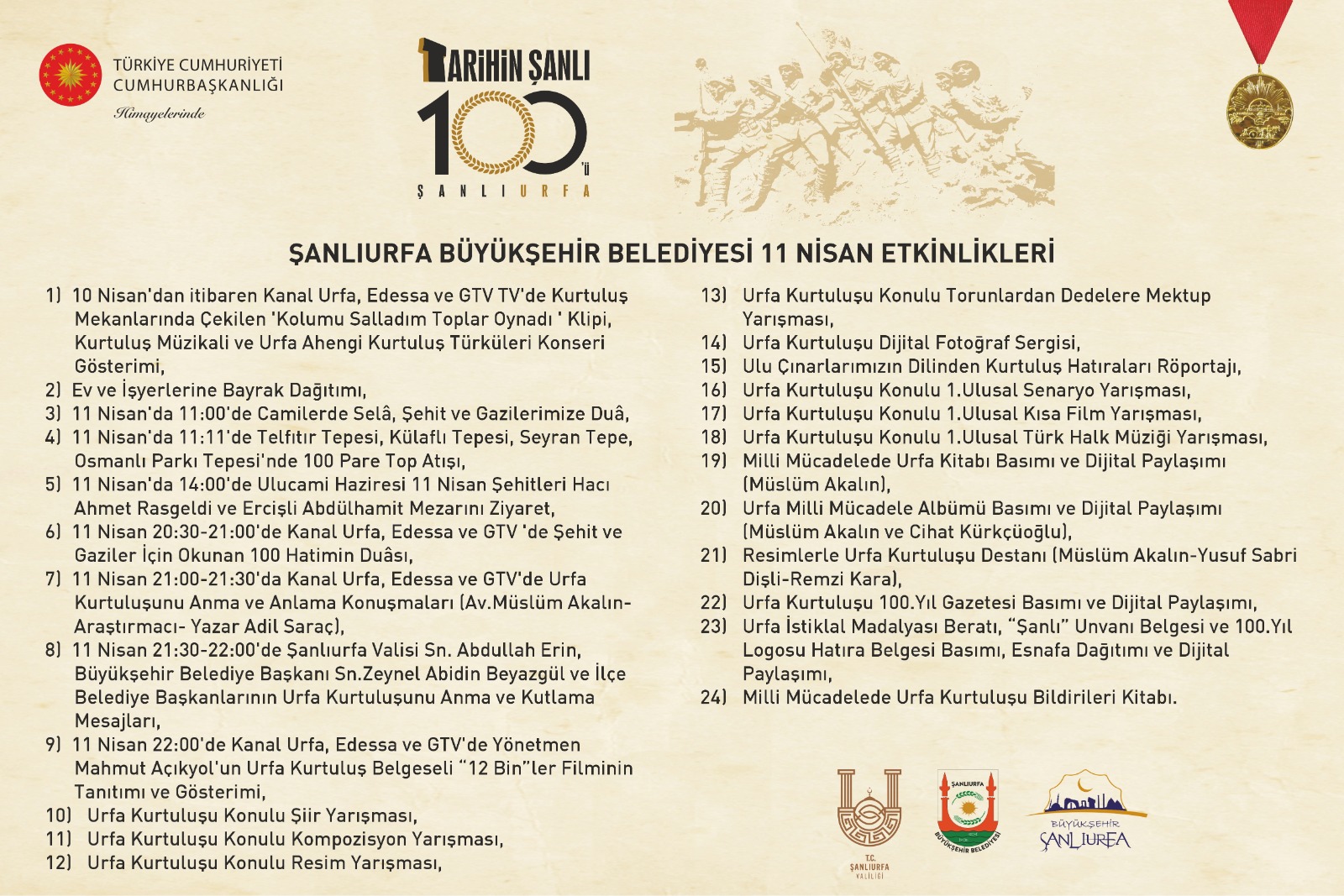 Şanlıurfa Büyükşehir Belediyesi tarafından organize edilen ve Türkiye Cumhuriyeti Cumhurbaşkanlığı himayesinde gerçekleştirilecek olan "Kurtuluşunun 100. Yılında Uluslararası Kültür ve Tarih Festivali"nin etkinlik programı şu şekilde belirlendi;