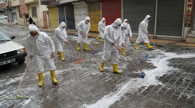 Haliliye Belediyesi, tüm dünyayı etkisi altına alan yeni tür koronavirüs (COVID-19) salgınından korunma tedbirleri kapsamında hummalı bir şekilde çalışmaya devam ediyor. Belediyenin her biriminde tedbir çerçevesinde faaliyetler yürütülürken, Temizlik ve dezenfektasyon ekipleri Bağlarbaşı Mahallesinde bulunan cadde ve sokakları deterjanlı köpüklü su ile yıkayarak dezenfekte etti.