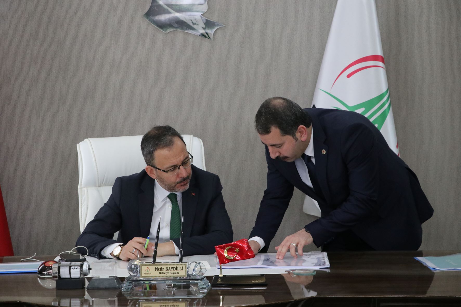 Şanlıurfa'ya gelen Gençlik ve Spor Bakanı Mehmet Muharrem Kasapoğlu Karaköprü Belediye Başkanı Metin Baydilli'yi makamında ziyaret ederek ilçede yapılacak gençlik ve spor merkezleri için desteklerini iletti