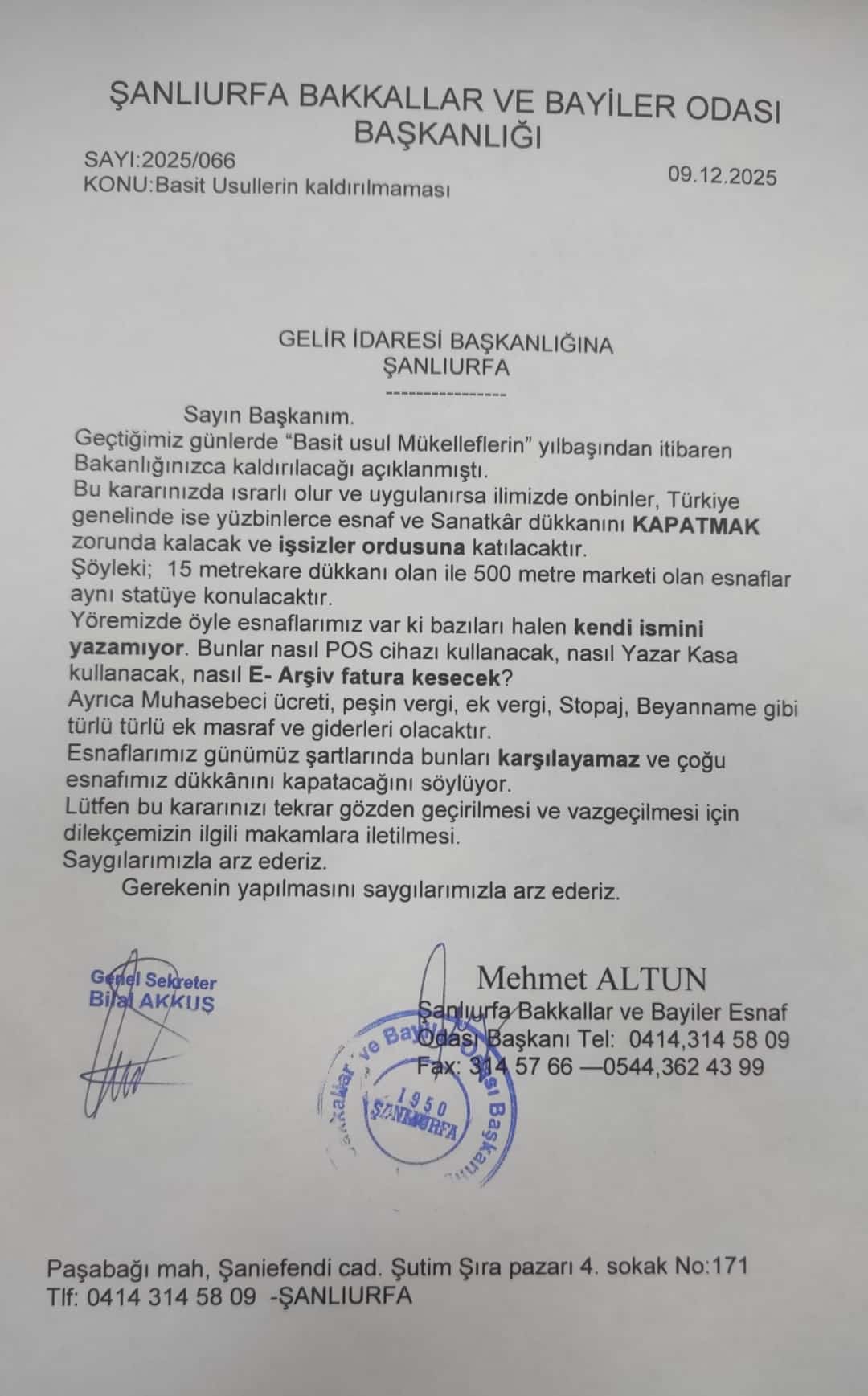 Şanlıurfa Bakkallar ve Bayiler Odası Başkanı Mehmet Altun, daha önce Maliye Bakanı tarafından açıklanan, Cumhurbaşkanı tarafından onaylanan ve Resmî Gazete’de yayımlanan “Basit Usul Mükellefiyetinin kaldırılması” yönündeki düzenlemenin durdurulması için girişimde bulunduklarını açıkladı.
