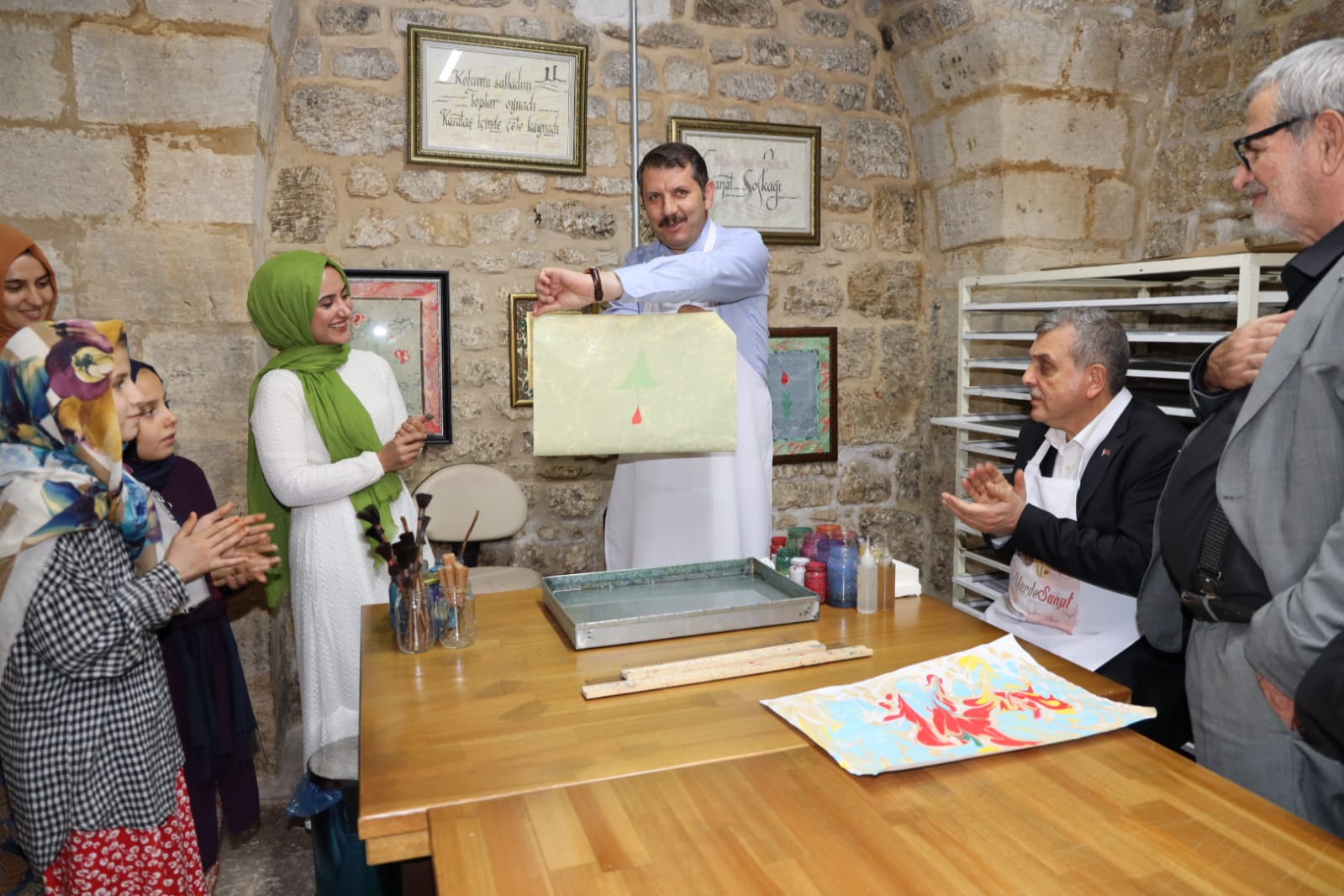 Şanlıurfa Büyükşehir Belediye Başkanı Zeynel Abidin Beyazgül ile Vali Salih Ayhan, Kültür Sanat sokağında Ebru çalışmasına katıldı. Vali Ayhan, kendi elleriyle çizdiği Ebru sanatıyla herkesi kendine hayran bıraktı. Yaklaşık 2 saat süren ziyaretin ardından Başkan Beyazgül ile Vali Ayhan öğrencilere başarılar diledi.