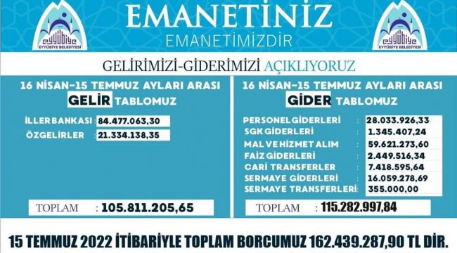 Eyyübiye Belediye Başkanı Mehmet Kuş, gelir gider tablosu ile şeffaf belediyecilik örneği sergilemeye devam ediyor. Başkan Kuş, belediyenin 16 Nisan - 15 Temmuz tarihleri arasındaki gelir gider tablosunu açıkladı.