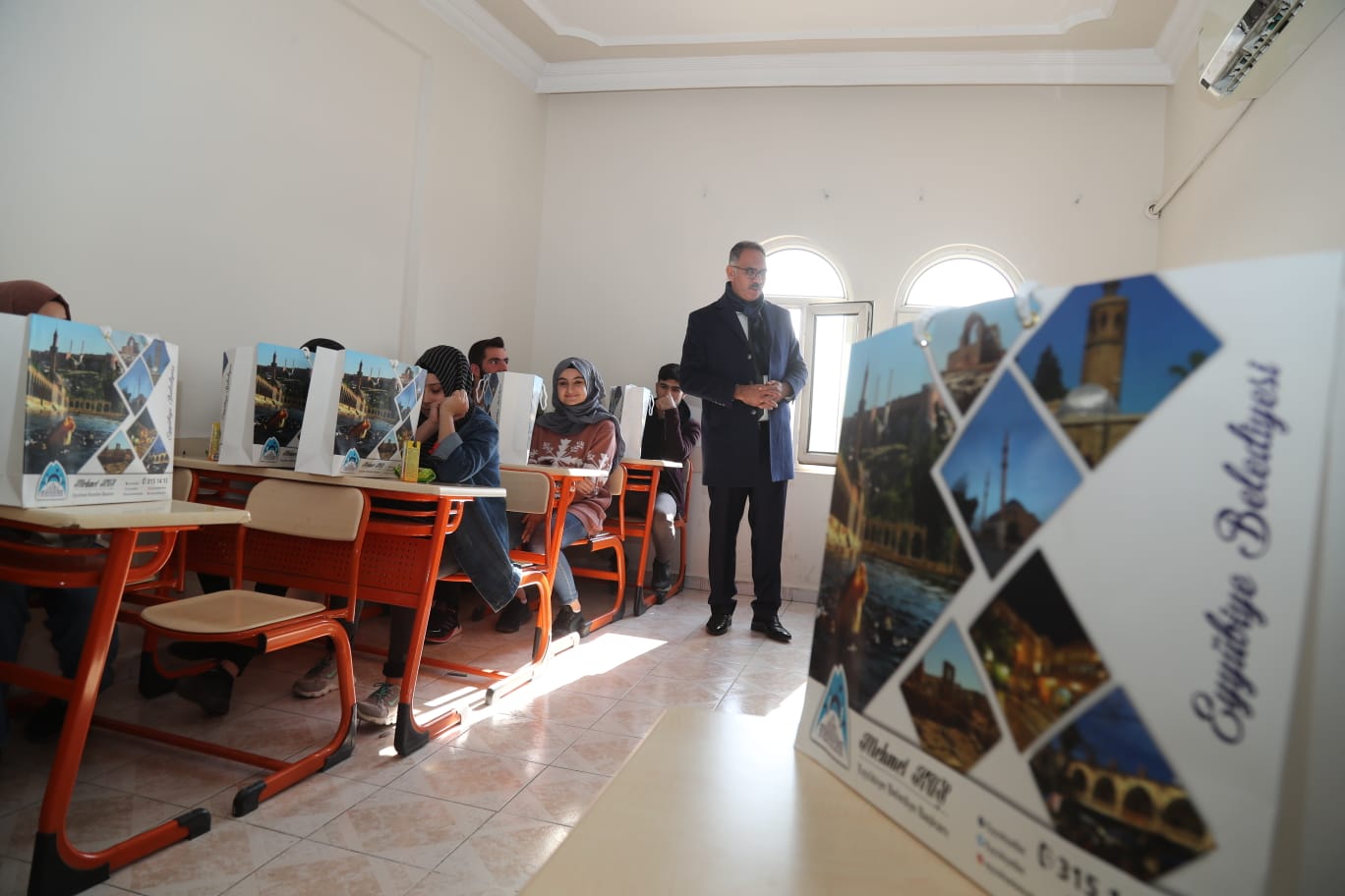 Eyyübiye Belediye Başkanı Mehmet Kuş, Eyyübiye Belediyesine bağlı gençlik merkezlerinde üniversite sınavlarına hazırlanan öğrencilere eğitim seti ve soru bankası seti hediye etti.