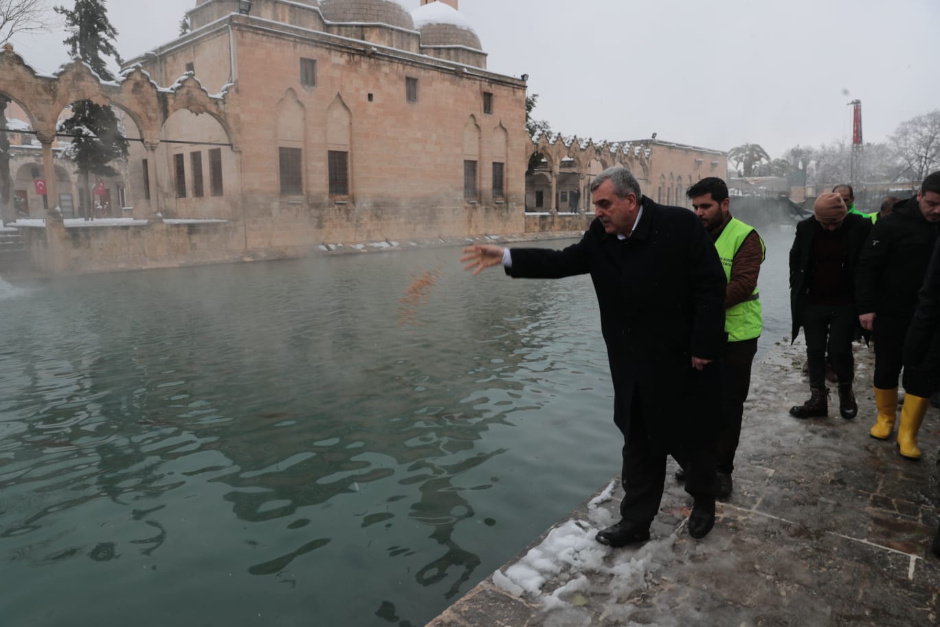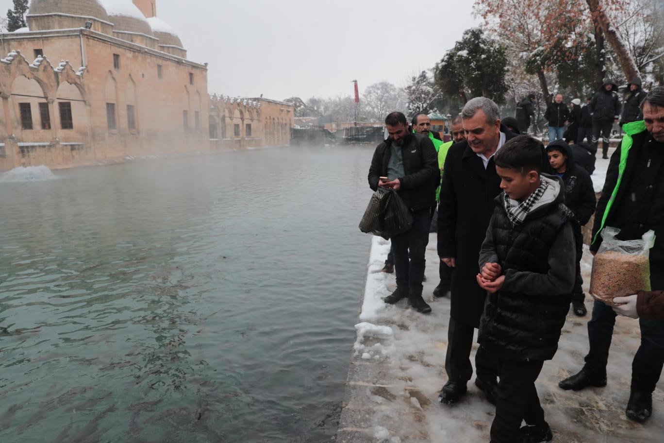 Kar nedeniyle insan sirkülasyonunun azaldığı Balıklıgöl’e giden Şanlıurfa Büyükşehir Belediye Başkanı Zeynel Abidin Beyazgül, , kentin simgesi Balıklıgöl’deki balıklara vatandaşlarla birlikte yem attı.
