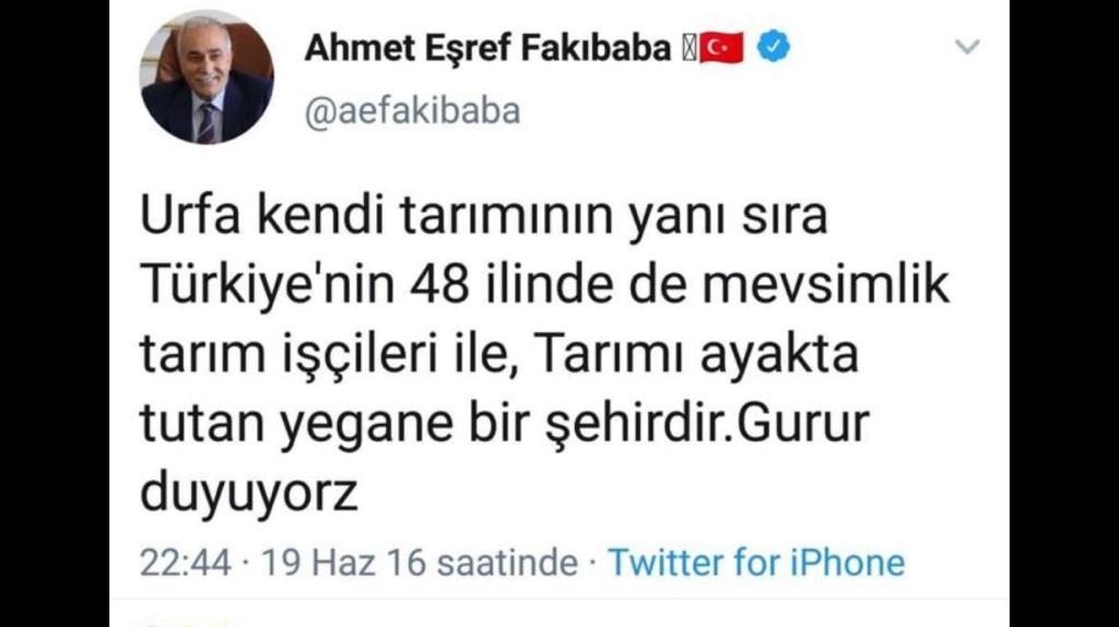 Fakıbaba, Sosyal Medya hesaplarından “Urfa kendi tarımının yanı sıra Türkiye’nin 48 ilinde de mevsimlik tarım işçileri ile, Tarımı ayakta tutan yegane bir şehirdir. Gurur duyuyoruz.”