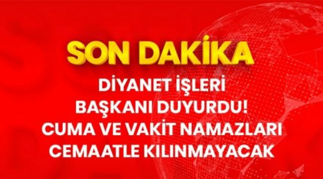 Diyanet İşleri Başkanı Prof. Dr. Ali Erbaş, "Cuma namazı başta olmak üzere cami ve mescitlerde cemaatle namaza ara verilmesi gerekli hale gelmiştir. Cami ve mescitlerde cuma ve vakit namazlarının cemaatle kılınmaması kararı alınmıştır. Münferiten namaz kılmak isteyen vatandaşlar için camilerimiz açık olacaktır." dedi.