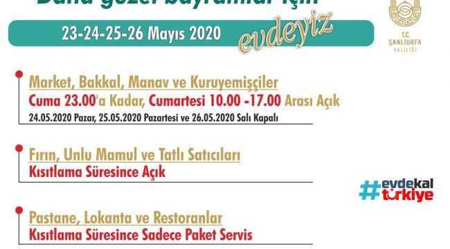 Ramazan Bayramı münasebetiyle, sokağa çıkma kısıtlamasının olduğu 23.05.2020 Cumartesi, 24.05.2020 Pazar, 25.05.2020 Pazartesi ve 26.05.2020 Salı günleri, lokanta ve restoran tarzı işyerleri sadece evlere paket servis şeklinde hizmet sunabilecek.
