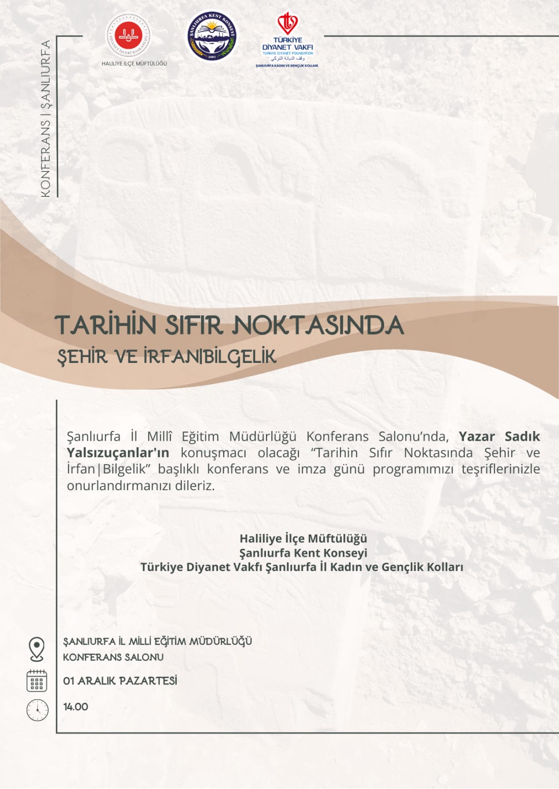 Konferans, 1 Aralık Pazartesi günü saat 14.00’te Milli Eğitim Müdürlüğü Konferans Salonu’nda gerçekleştirilecek. Etkinlik; Şanlıurfa Kent Konseyi, Haliliye İlçe Müftülüğü, Türkiye Diyanet Vakfı ve paydaş kurumların iş birliğiyle düzenleniyor.