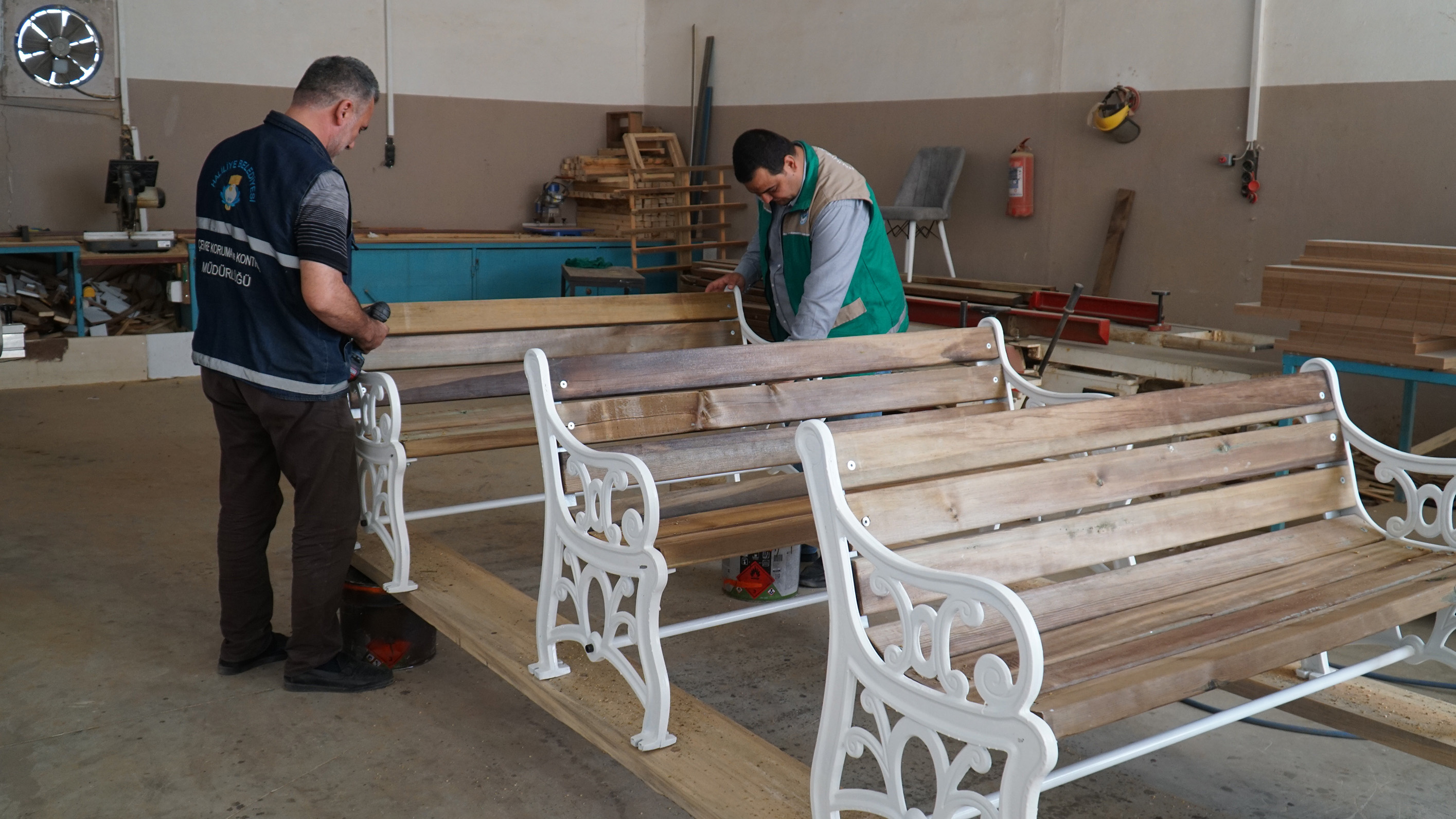 Haliliye Belediyesi bünyesinde kurulan atölye ile üretilen kamelya, piknik masası ve banklar parklara kazandırılıyor.