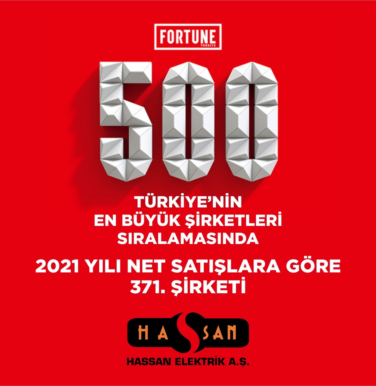 Hassan Elektrik, 13 yıl gibi kısa bir zaman diliminde ulaştığı 1,5 milyar TL’yi aşan net satış hacmiyle Fortune 500 Türkiye 2021 listesine 371. sıradan giriş yaptı.