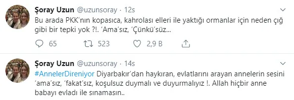 Şoray Uzun, "Diyarbakır'dan haykıran, evlatlarını arayan annelerin sesini 'ama'sız, 'fakat'sız, koşulsuz duymalı ve duyurmalıyız! Allah hiçbir anne babayı evladı ile sınamasın" ifadelerini kullanırken Vildan Atasever de "Diyarbakır'da evlatları için feryat eden ve evlatlarına ulaşmaya çalışan anaların sesini 'amasız' ve 'fakatsız' duymalıyız. Tepkimizi açık ve duyulacak bir şekilde göstermeliyiz. Allah hiçbir anneye evlat acısı vermesin." diye yazdı.