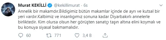 Murat Kekili, "Annelik bir makamdır. Bildiğimiz bütün makamlar içinde de ayrı ve kutsal bir yeri vardır. Kalbimiz ve insanlığımız, sonuna kadar Diyarbakırlı annelerle birliktedir. Kim olursa olsun her görüşten sanatçı taşın altına elini koymalı ve bu konuya siyasal bakmamalıdır." değerlendirmesini yaptı.
