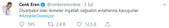 Sanatçı Cenk Eren, "Anneler Direniyor" etiketiyle paylaştığı mesajında, "Diyarbakır'daki anneler inşallah sağ salim evlatlarına kavuşurlar.", Uğur Işılak ise "Evladı anasından çalan vicdansızlar... Anaların ahında boğulasınız" ifadelerine yer verdi.