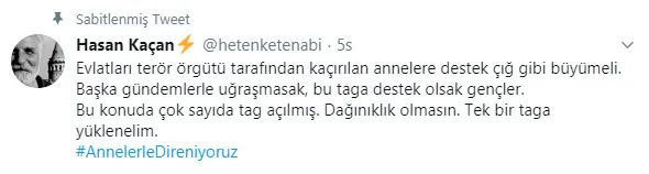 Karikatürist, oyuncu ve film yapımcısı Hasan Kaçan ise, paylaşımında "Annelerler beraberiz ya sen" etiketiyle paylaştığı mesajında, "Terör örgütü PKK'nın patronları anaların çığlığını bastırmak, gündemden düşürmek için ciddi çabalıyor. Peş peşe (müzik mesajlı)... Anaların sesini bastıramayacaksınız. Durmak yok. Tek gündemimiz bu." ifadelerine yer verdi.