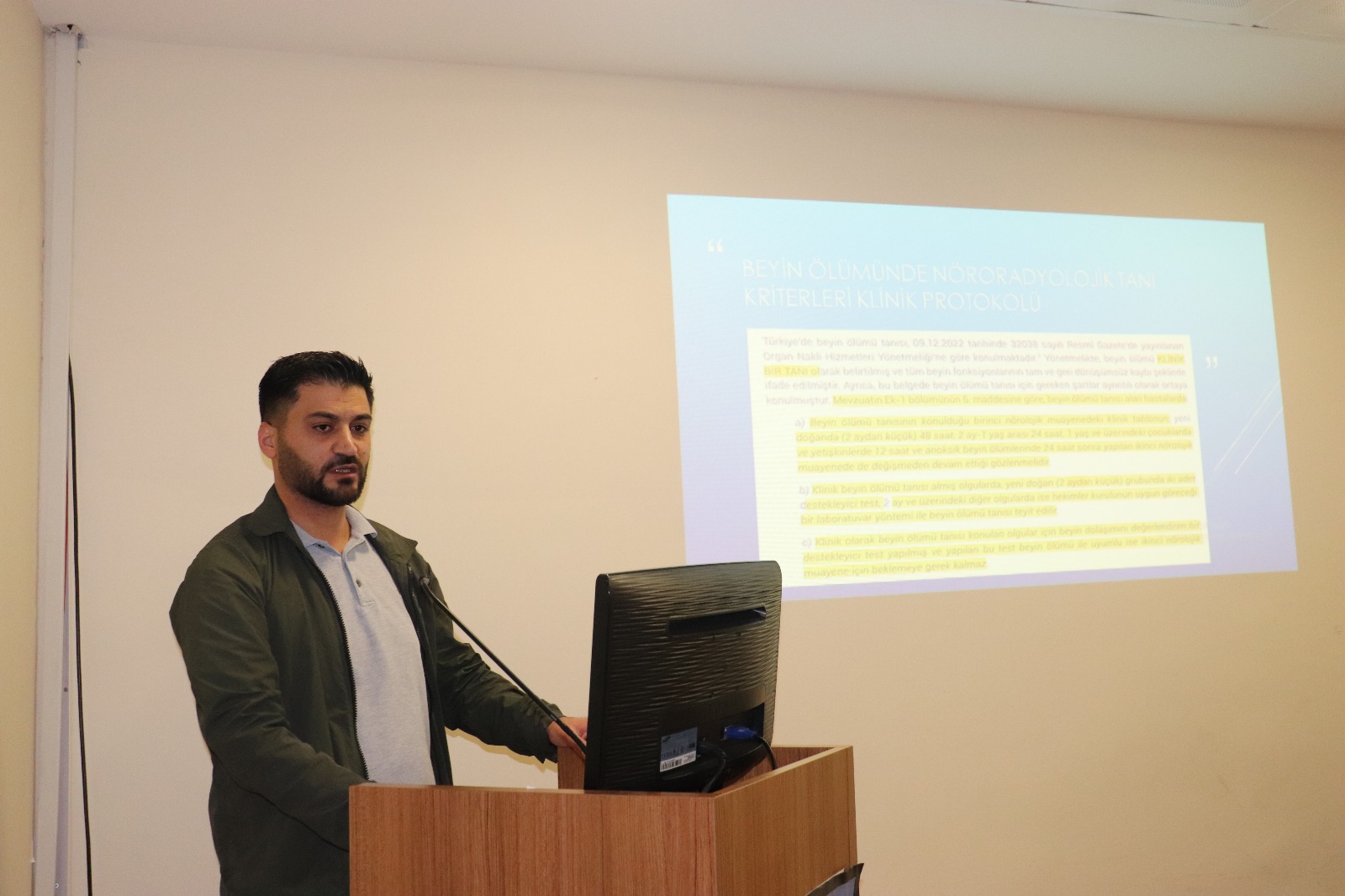 Radyoloji Anabilim Dalı Dr. Öğr. Üyesi Eyüp Kaya ise “Beyin Ölümü Tanısında Radyolojik İncelemeler” başlıklı eğitim seminerinde, beyin ölümü tanısında görüntüleme yöntemlerinin rolüne değindi. Dr. Kaya, “Radyolojik incelemeler tanının doğrulanmasında büyük önem taşır. Bu konuda doğru ve hızlı değerlendirme, organ bağış sürecinin en kritik aşamasıdır.” dedi.