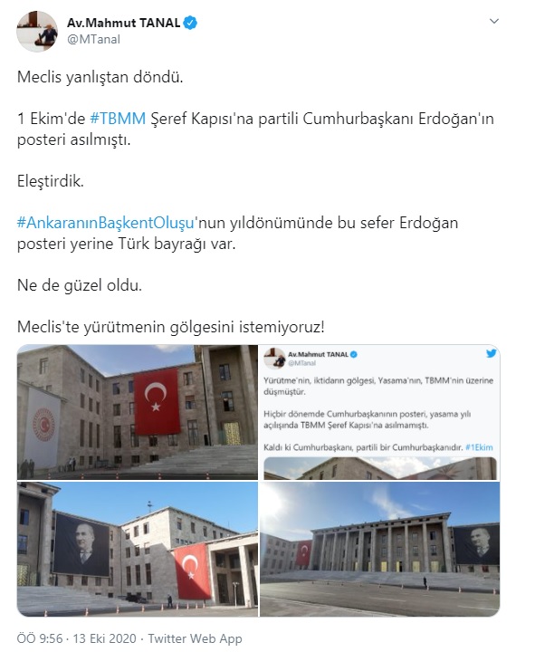 CHP’li vekil Mahmut Tanal, fotoğrafları paylaşarak “Meclis yanlıştan döndü. 1 Ekim'de TBMM Şeref Kapısı'na partili Cumhurbaşkanı Erdoğan'ın posteri asılmıştı. Eleştirdik. Ankara’nın başkent oluşunun yıldönümünde bu sefer Erdoğan posteri yerine Türk bayrağı var. Ne de güzel oldu. Meclis'te yürütmenin gölgesini istemiyoruz!” ifadelerini kullandı.