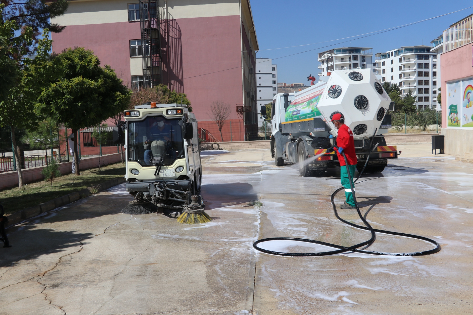 Karaköprü Belediyesi Temizlik İşleri Müdürlüğü dezenfekte ekipleri tarafından yürütülen çalışmada ilçedeki anaokulu, ilkokul, ortaokul ve liselerde dezenfekte ve yıkama çalışması yapılarak öğrencilerin temiz bir ortamda eğitime başlamaları sağlanıyor.
