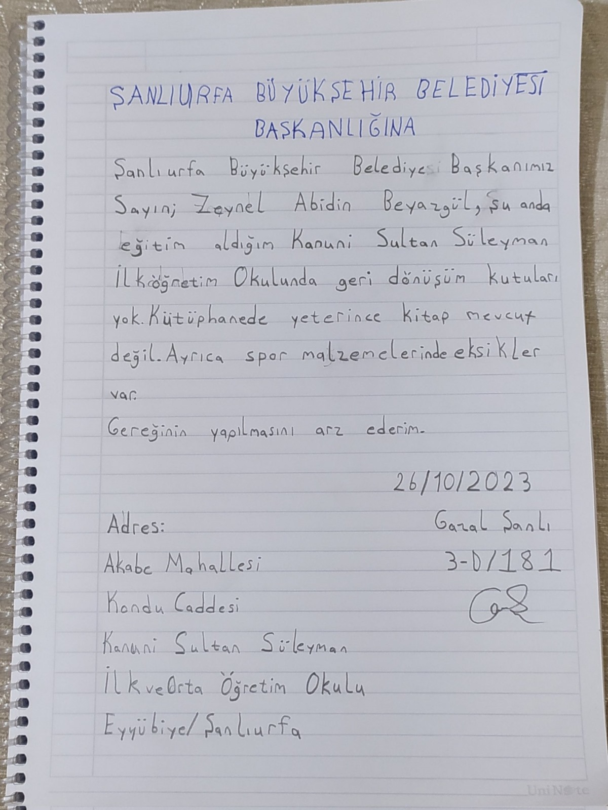 Kanuni Sultan Süleyman İlk ve Orta Okulunda okuyan 3. Sınıf öğrenicisi 8 yaşındaki Gazal Şanlı, okuldaki eksikliklerin yer aldığı bir dilekçe yazdı. Şanlı, yazdığı dilekçeyi babasının sosyal medya hesabından paylaşarak Şanlıurfa Büyükşehir Belediye Başkanı Zeynel Abidin Beyazgül’den destek istedi.