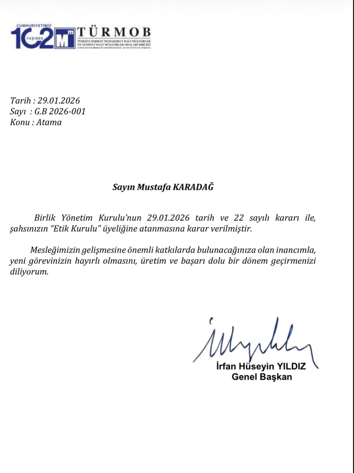 TÜRMOB Yönetim Kurulu’nun 29.01.2026 tarihli ve 22 nolu kararı ile Etik Kurul Üyeliği görevine atanan Karadağ, kararın ardından yaptığı açıklamada; TÜRMOB Genel Başkanı Hüseyin İrfan Yıldız, Genel Sekreter Yahya Arıkan ve yönetim kurulu üyelerine teşekkür etti.