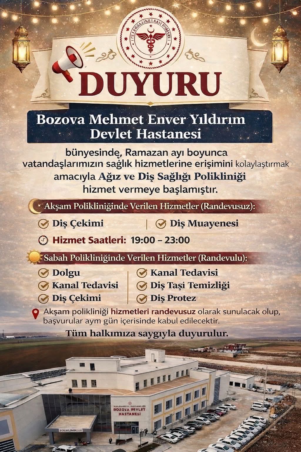 Konuya ilişkin açıklamada bulunan Hastane Başhekimi Mehmet Fatih Aksoy, özellikle Ramazan ayında gündüz saatlerinde sağlık kuruluşlarına başvurmakta zorlanan vatandaşlar için önemli bir düzenleme yapıldığını belirtti. Başhekim Aksoy, “Vatandaşlarımızın mağduriyet yaşamaması ve ağız-diş sağlığı hizmetlerine daha rahat ulaşabilmesi için gerekli planlamaları tamamladık. Ramazan ayı süresince hem sabah hem de akşam polikliniğimiz aktif olarak hizmet verecektir” dedi.