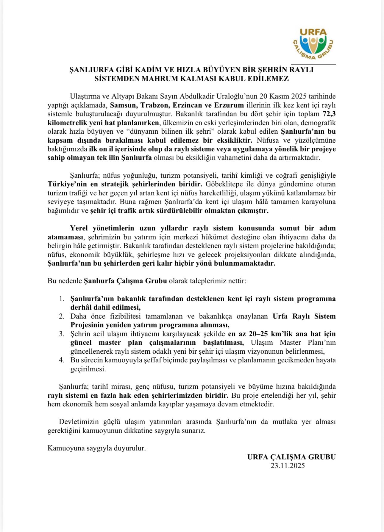 Şehrin demografik yapısı, gelişme hızı ve turizm trafiği dikkate alındığında Şanlıurfa’nın raylı sistemi en çok hak eden şehirlerden biri olduğu vurgulanan açıklamada, projenin ertelenmesinin ekonomik ve sosyal kayıpları artırdığına dikkat çekildi.