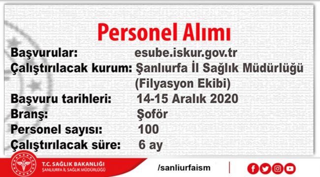 ''Sağlık Müdürlüğüne İŞKUR üzerinden TYP (Toplum Yararına Personel) kapsamında İlçe İkametgâh adreslerine göre 6 ay geçici süreyle Filyasyon ekiplerinde görev alacak 100 (Şoför) personel alımı yapılacaktır. Müracaatlar 14-15 Aralık 2020 tarihleri arasında esube.iskur.gov.tr üzerinden yapılacak olup, şahsi müracaat alınmayacaktır.'' duyurusu yapıldı.
