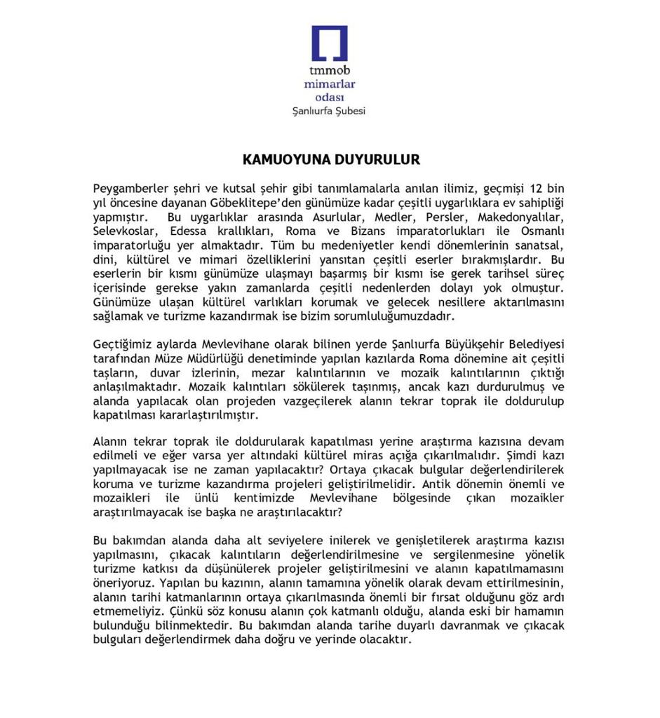 Şanlıurfa Mimarlar odasının Tarihi kazılarla ilgili yaptığı açıklaması şöyle: