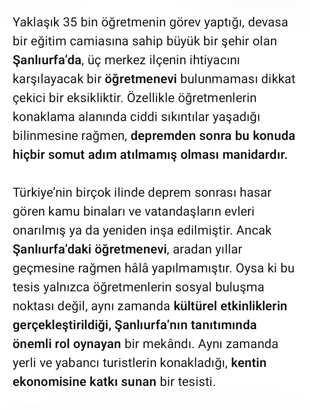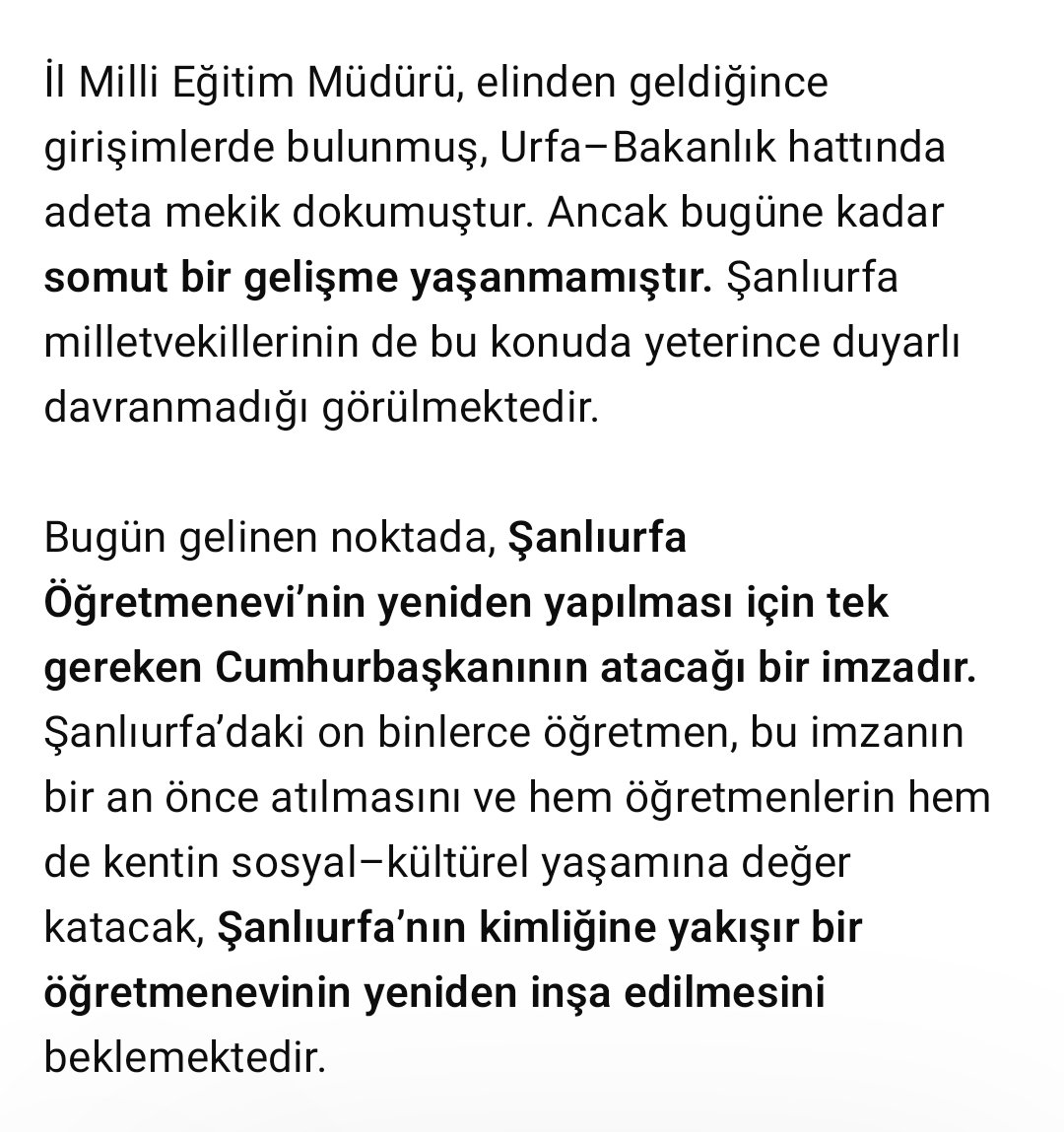 “İl Milli Eğitim Müdürlüğü elinden gelen gayreti göstermiş, Urfa–Bakanlık hattında defalarca girişimlerde bulunmuştur. Ancak bugüne kadar somut bir gelişme yaşanmamıştır. Şanlıurfa milletvekillerinin de bu konuda yeterince duyarlı davranmadığı görülmektedir. Bugün gelinen noktada Şanlıurfa Öğretmenevi’nin yeniden yapılması için tek gereken Cumhurbaşkanımızın atacağı bir imzadır.”