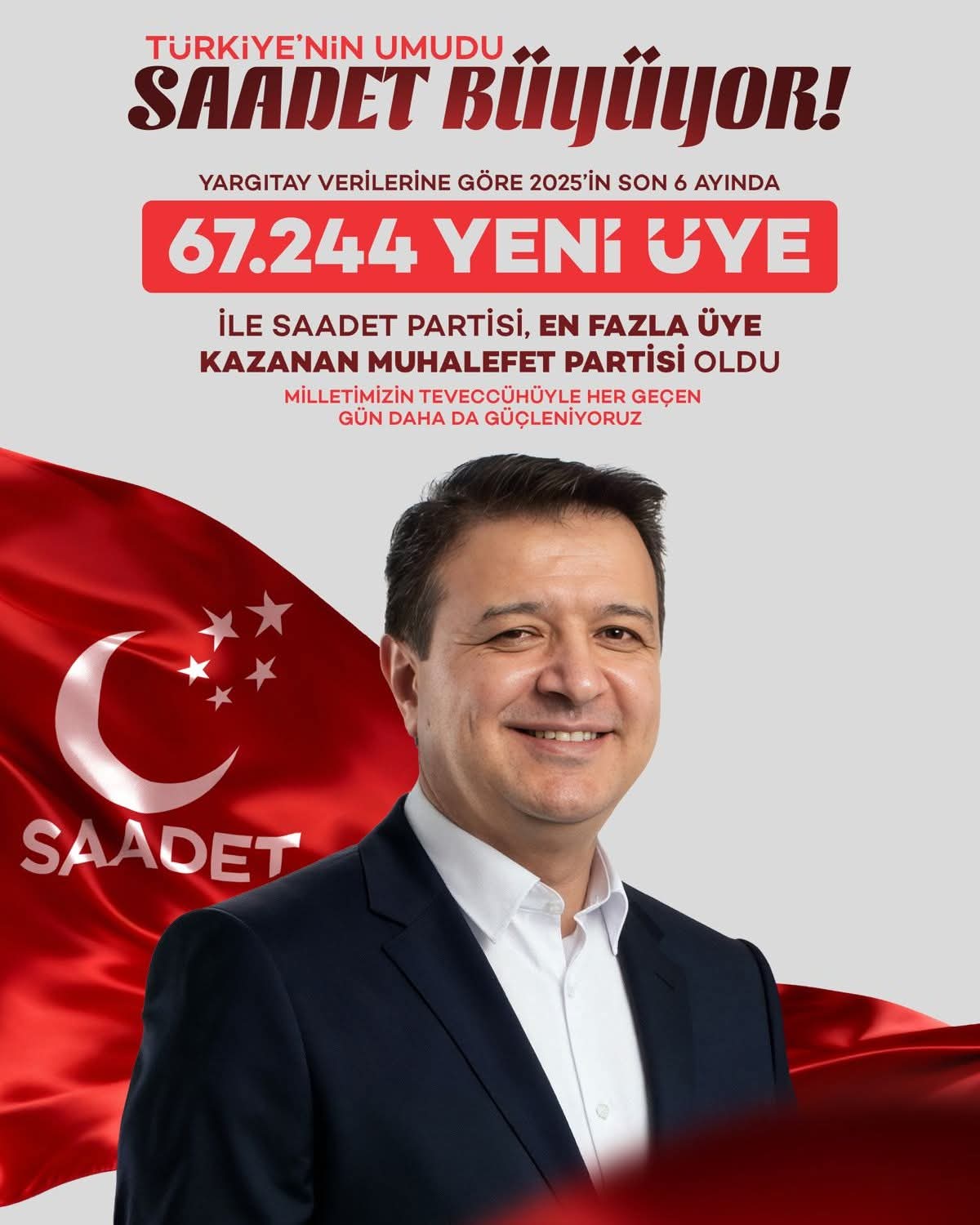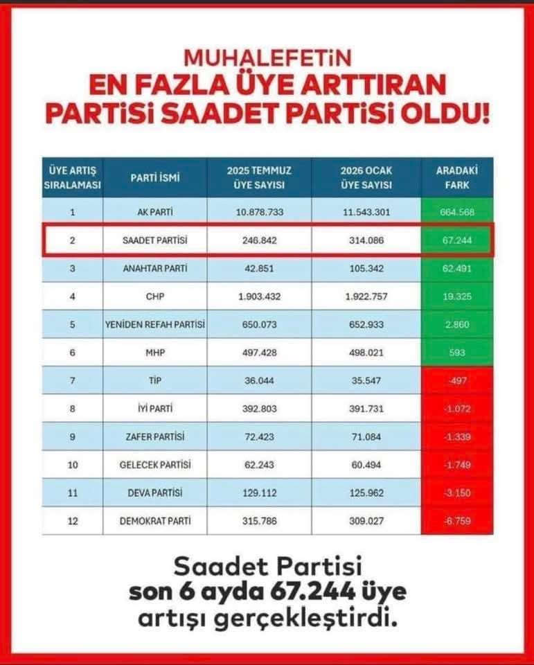 Verilere göre Saadet Partisi’ne bu süreçte 67 bin 244 yeni üye katıldı. Bu artışla Saadet Partisi, Türkiye’de en fazla üye kazanan muhalefet partisi oldu.